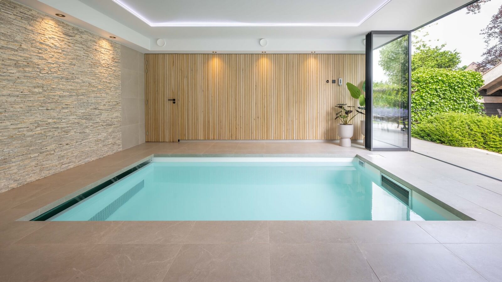 Op dit project, een particulier binnenzwembad, is gebruik gemaakt van slechts 2 type tegels. Eén wand is bekleed met stonepanels, door de grove structuur hiervan krijgt de wand een stoere, natuurlijke uitstraling.