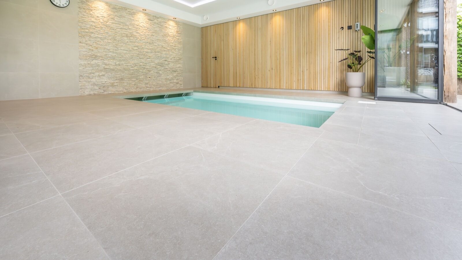 Ter plaatse van het zwembad hebben we van de 60x60 vloertegel een randtegel laten maken, dit zorgt voor een verzorgde afwerking van tegelvloer naar bassin. De vloertegel is van binnen naar buiten doorgelegd, zodat binnen en buiten mooi in elkaar overlopen.